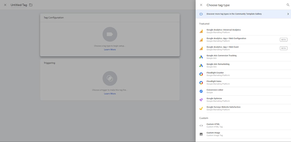 Figure 1: On the right side of the screen, you will notice a range of analytics platforms that GTM can seamlessly integrate with. The beauty of GTM lies in its flexibility, as the tags you install are not limited to Google's own analytics suite. In fact, it is quite common to have tags that send data to major competitors of Google, such as Facebook's Pixel. This means that GTM can cater to individuals with diverse analytics preferences, accommodating a variety of platforms and tools beyond a specific company's analytics ecosystem.