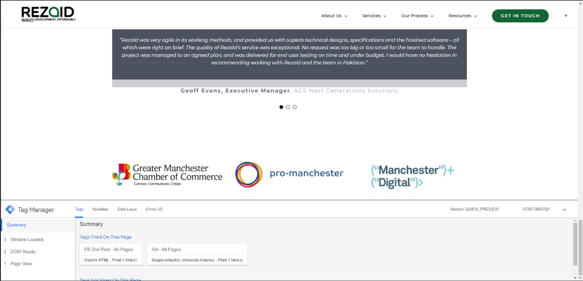 Figure 4: Displayed above the GTM interface is a simulated version of Rezaid's website. Despite its identical appearance to the live website, it is important to note that this is merely a preview of how the webpage functions even with the inclusion of tags. This preview serves as a valuable tool for digital marketers, as it allows them to verify if their programming has inadvertently caused any disruptions or glitches on the website. By conducting thorough checks in this preview environment, digital marketers can ensure that actual visitors to the webpage do not encounter any issues or complications.