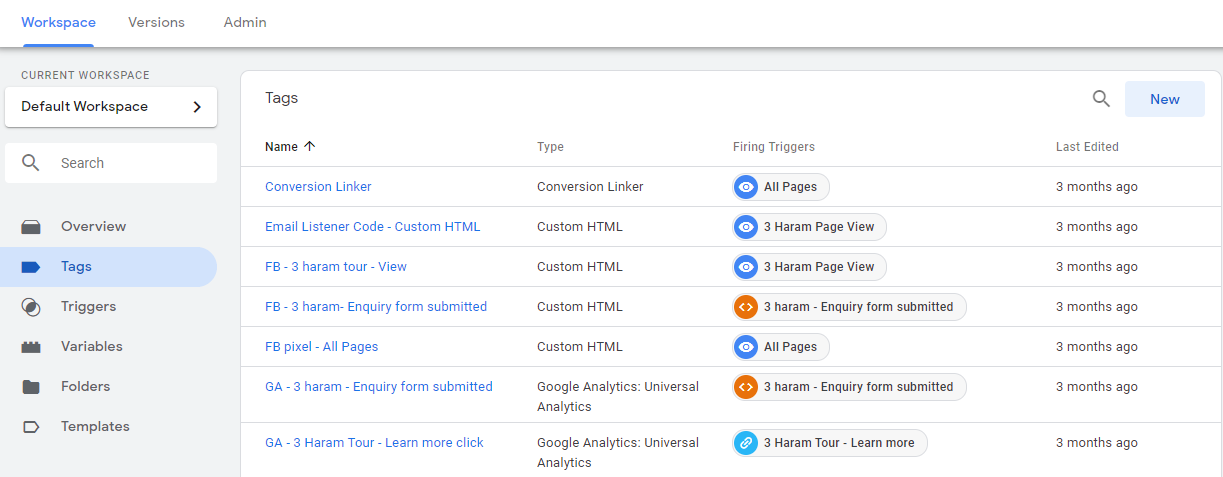 Figure 2: In this illustration, we observe a collection of tags actively operating within a single website. Their names are indicative of their intended tracking purposes, allowing GTM users to quickly identify the function of each tag on the website. Commonly employed tags include those monitoring form submissions or tracking user clicks on elements that expand additional text. These types of tags represent popular choices in the realm of GTM, enabling efficient tracking of crucial user interactions.