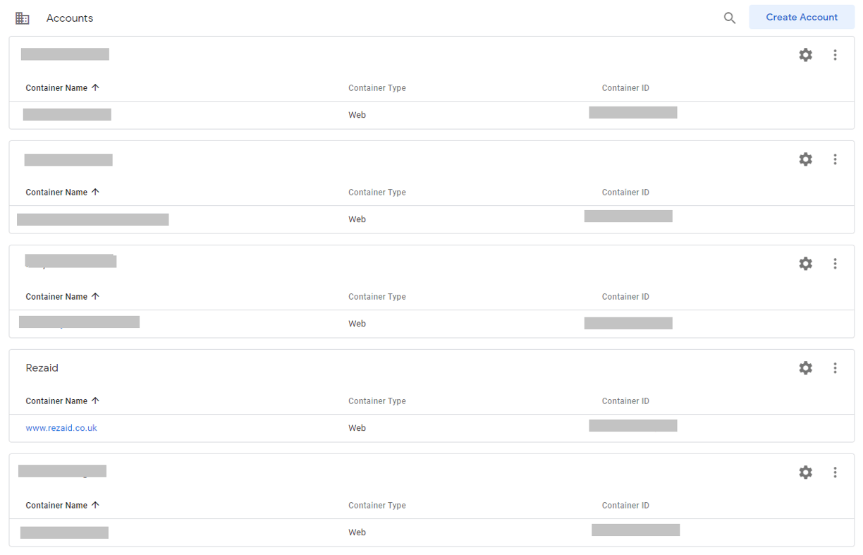 Figure 3: In GTM, a single account has the ability to accommodate multiple containers. Typically, each container is dedicated to housing tags for a specific website. Digital marketing professionals often find it convenient to assign container names based on the respective websites they serve. This approach offers a significant advantage as it allows users to easily track which tags are associated with each website. Furthermore, it ensures a tidy and comprehensible organization that can be easily shared with clients, further enhancing collaboration and clarity for digital marketing professionals.