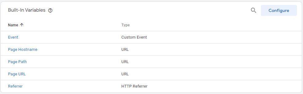 To begin, navigate to the "Variables" option in the left-side navigation menu of the GTM interface. You'll observe that certain interactions that GTM can track are enabled by default.