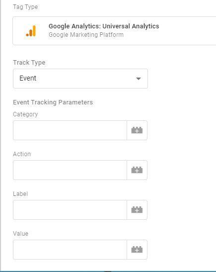 To set up new tags, navigate to the "Tags" section on the left side of the GTM interface. Selecting "Event" as the track type will present you with the following options: