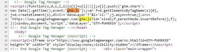 Figure 2: To view a webpage's source code, you can use the shortcut Ctrl + U or right-click on the webpage and select "View Page Source." The resulting screen will resemble the example shown. If you spot the term 'gtm.js' in the source code, it indicates that GTM has been successfully installed on the webpage. You can try this on various web pages to witness the widespread adoption of GTM.