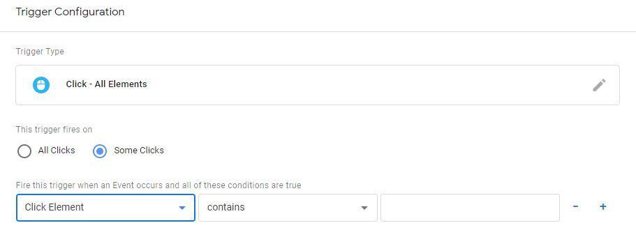 Figure 6: In the empty field at the bottom, you will input the string for the button you want to track. Don't forget to connect the trigger to the corresponding tag on the "Tag Configuration" screen!